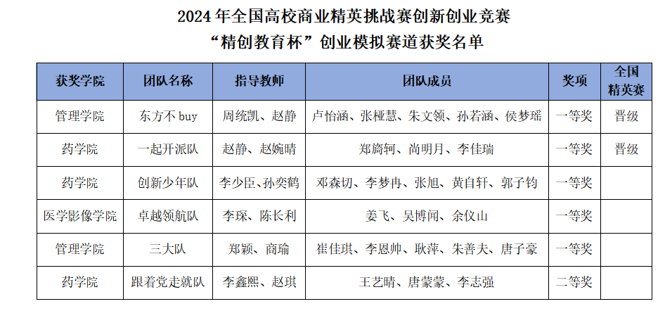 近日,2024全國高校商業(yè)精英挑戰(zhàn)賽創(chuàng)新創(chuàng)業(yè)競賽“精創(chuàng)教育杯”創(chuàng)業(yè)模擬賽道全國總決賽落下帷幕,齊魯醫(yī)藥學(xué)院6支參賽獲得全國一等獎5項、二等獎1項,其中2支隊伍晉級全國精英賽。