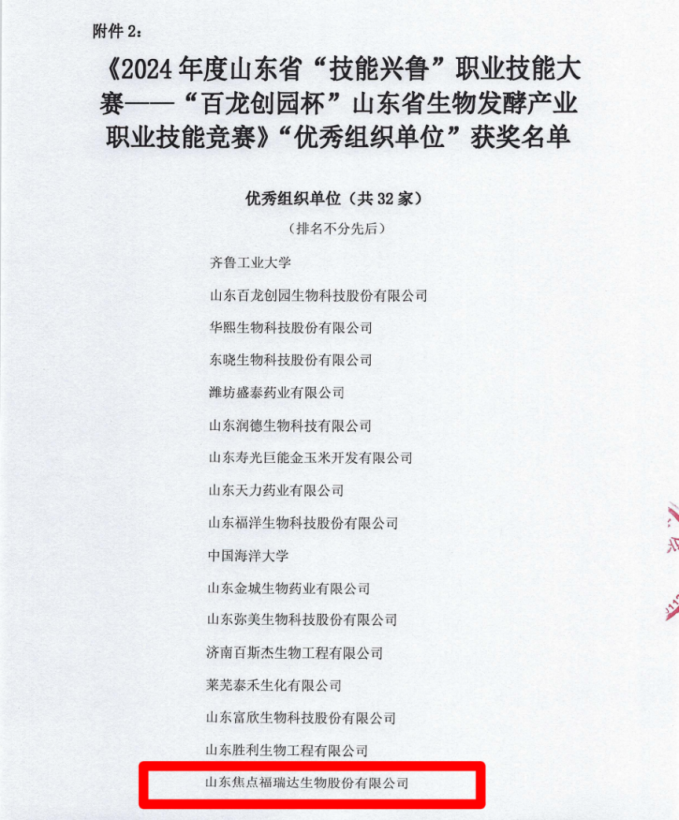 近日,2024年度山東省“技能興魯”職業(yè)技能大賽——山東省生物發(fā)酵產(chǎn)業(yè)職業(yè)技能競賽獲獎名單公布,福瑞達(dá)旗下焦點福瑞達(dá)、福瑞達(dá)生物科技、福瑞達(dá)生物股份憑借優(yōu)異的競賽成績和良好的作風(fēng)表現(xiàn)被大賽組委會評選為“優(yōu)秀組織單位”。在職工組化學(xué)檢驗工、生化檢驗工、淀粉及淀粉糖制造工3個競賽項目中,13名職工榮獲個人一、二、三等獎。