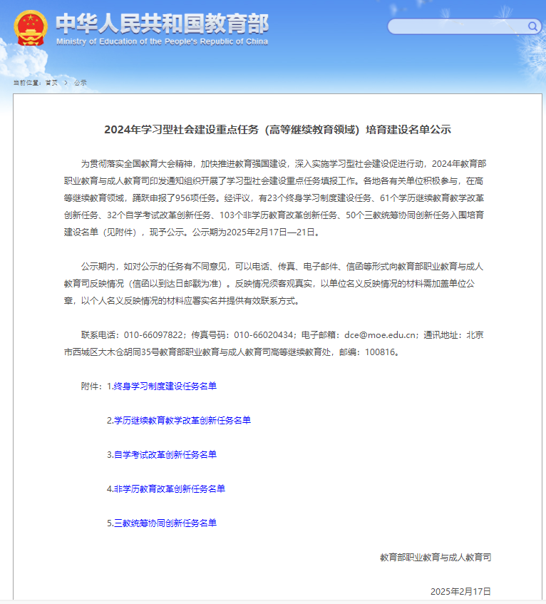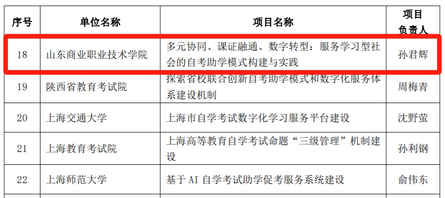 經(jīng)教育部專家評(píng)議,在高等繼續(xù)教育領(lǐng)域956項(xiàng)任務(wù)中,共評(píng)選出23個(gè)終身學(xué)習(xí)制度建設(shè)任務(wù)、61個(gè)學(xué)歷繼續(xù)教育教學(xué)改革創(chuàng)新任務(wù)、32個(gè)自學(xué)考試改革創(chuàng)新任務(wù)、103個(gè)非學(xué)歷教育改革創(chuàng)新任務(wù)、50個(gè)三教統(tǒng)籌協(xié)同創(chuàng)新任務(wù)入圍培育建設(shè)名單。山東商職學(xué)院憑借在服務(wù)區(qū)域?qū)W習(xí)型社會(huì)建設(shè)、推動(dòng)職業(yè)教育、高等教育與繼續(xù)教育融合發(fā)展方面的創(chuàng)新實(shí)踐與顯著成效,與眾多知名高校同時(shí)入選自學(xué)考試改革創(chuàng)新任務(wù)。該項(xiàng)目在山東省教育招生考試院指導(dǎo)下,聯(lián)合山東大學(xué)等主考院校,著力構(gòu)建協(xié)同創(chuàng)新機(jī)制、思政教育與技術(shù)教育融合機(jī)制、課程實(shí)踐考核置換機(jī)制和監(jiān)督保障機(jī)制,打造“一站式”學(xué)習(xí)服務(wù)平臺(tái),推動(dòng)高等教育自學(xué)考試的數(shù)字化轉(zhuǎn)型升級(jí)。