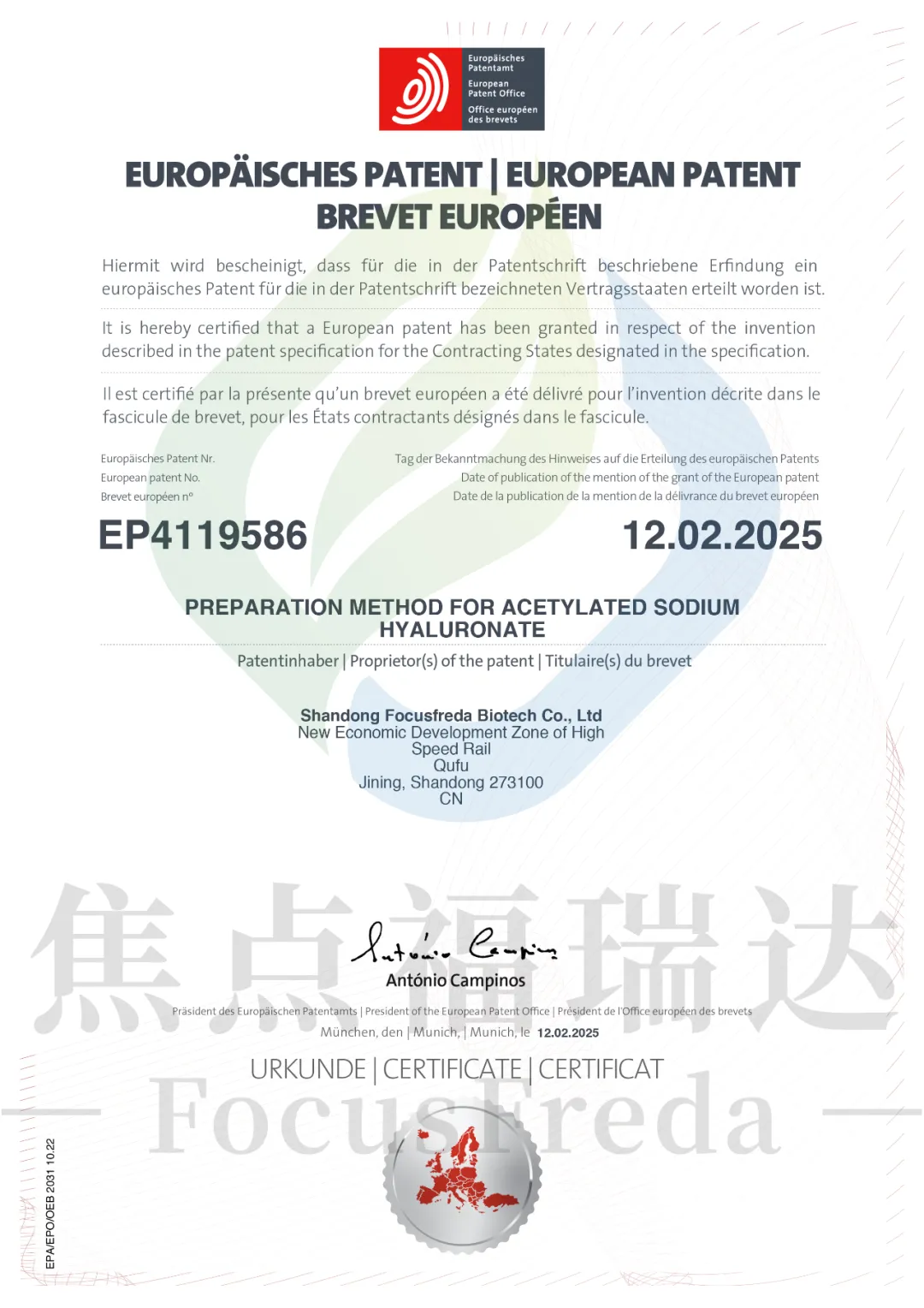 此次歐洲專利的成功授權,既是企業持續踐行知識產權核心戰略的里程碑式成果,更是構建全球化知識產權體系的戰略支點。未來,焦點福瑞達將繼續通過專利戰略布局構建技術護城河,以自主知識產權賦能透明質酸鈉產業升級,在透明質酸鈉領域鍛造具有更高含金量的國際化專利矩陣,為進一步開拓全球市場提供強有力的技術支撐。
