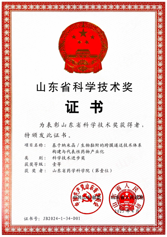 6月27日,山東全省科技大會在濟南召開,山東省藥學科學院牽頭研發的《基于納米晶/生物黏附的跨膜遞送技術體系構建與代表性藥物產業化》項目榮獲省科學技術進步獎一等獎。