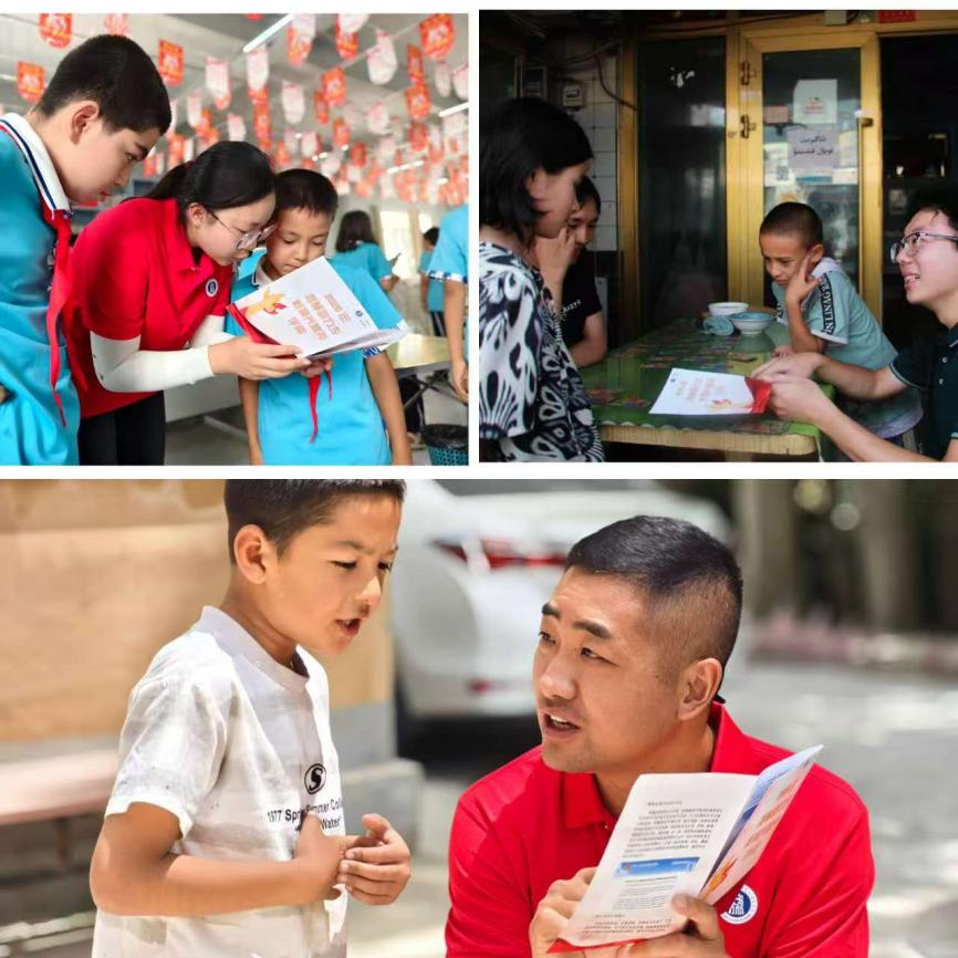 為大力推廣普通話,讓普通話真正走進群眾生活,青喀聯合實踐隊深入新疆喀什地區的多個縣城,開展多樣化的普通話推廣與文化交流活動。在疏附縣托克扎克鎮中心小學(習近平總書記2014年4月到訪地)開設趣味科普課堂,在喀什古城街邊設立流動教學點,在葉城縣藍橋社區餐廳開設午間小課堂,還深入偏遠小村開展入戶教學,在葉城縣易地搬遷宣教館宣講;同時將服務陣地向基層延伸,走進卡拉塔西庫執勤點與戍邊員圍坐交流,在博隆(3)村夜校為中青年群體開展系統普通話培訓,以語言為紐帶助力他們展現擔當;更具深意的是,青喀聯合實踐隊循著習近平總書記的足跡,探訪了帶領村民依靠先進技術共富的致富能手阿卜都克尤木·如則,走訪了博隆(3)村老黨員并聆聽紅色往事,讓奮斗故事與時代記憶在鄉音閑談中煥發新聲。