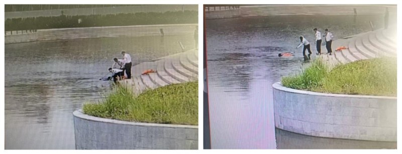 和超立即將現場情況上報物業(yè)監(jiān)控中心請求支援,并同步撥打報警電話,他自己則持續(xù)大聲與阿姨保持溝通、言語安撫,努力穩(wěn)定其情緒。張政則迅速跑向附近的應急物資存放點,取來救生圈與救生繩,奮力將救生圈拋投至阿姨附近水面,并高聲引導其抓住救生設備。很快,另一名聞訊趕來的隊員張萌也加入支援,三人默契配合、協力施救,最終成功將阿姨救助上岸。