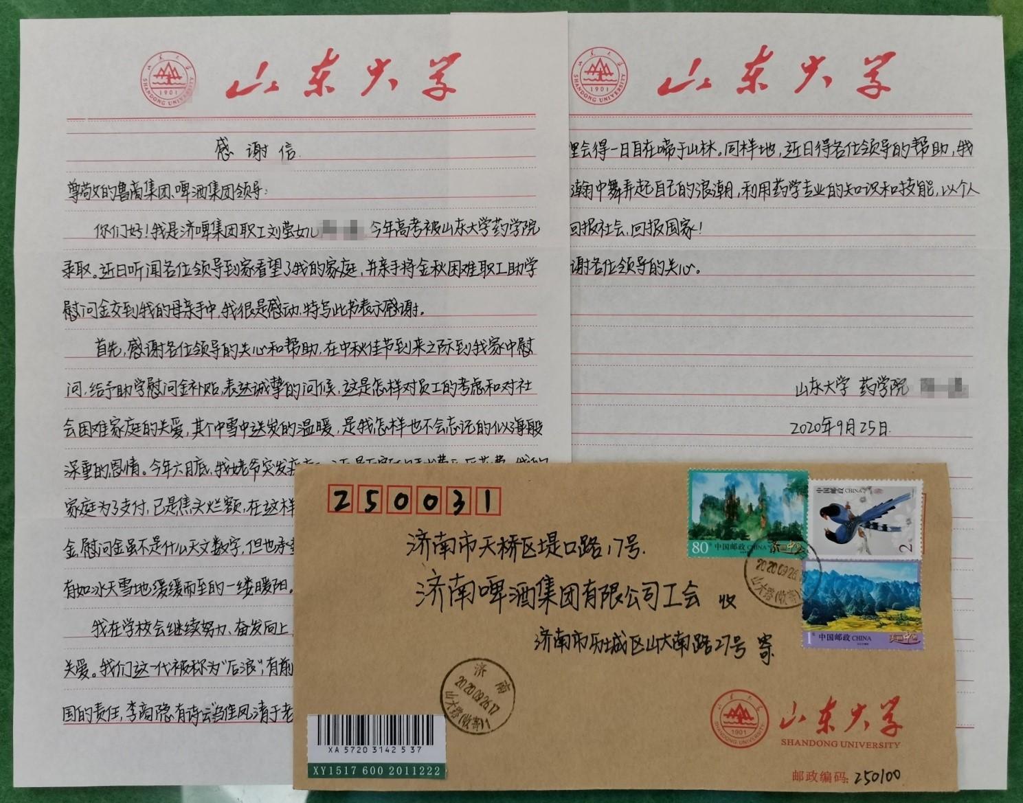 9月27日,濟(jì)啤集團(tuán)收到困難職工劉瑩女兒從學(xué)校寄來(lái)的感謝信。