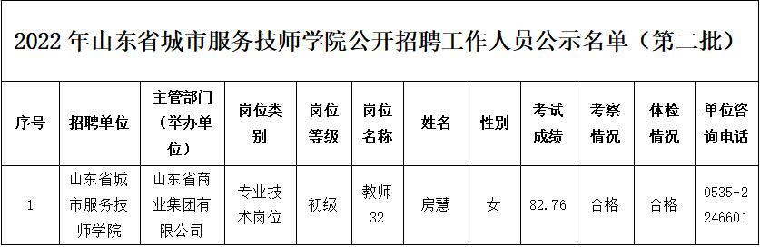 根據(jù)《中共山東省委組織部、山東省人力資源和社會(huì)保障廳關(guān)于印發(fā)2022年度省屬事業(yè)單位公開(kāi)招聘工作實(shí)施方案的通知》魯人社發(fā)〔2021〕18號(hào))等相關(guān)規(guī)定,山東省城市服務(wù)技師學(xué)院經(jīng)過(guò)公開(kāi)招聘報(bào)名、考試、考察、體檢等工作,現(xiàn)對(duì)擬聘用人員(第一批)進(jìn)行公示,公示期為7個(gè)工作日,自2022年8月22日至2022年8月30日(不含節(jié)假日)。公示期間,如對(duì)公示人選有異議,請(qǐng)及時(shí)向山東省商業(yè)集團(tuán)有限公司反映。