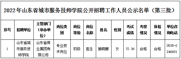 根據(jù)《中共山東省委組織部、山東省人力資源和社會(huì)保障廳關(guān)于印發(fā)2022年度省屬事業(yè)單位公開(kāi)招聘工作實(shí)施方案的通知》(魯人社發(fā)〔2021〕18號(hào))等相關(guān)規(guī)定,山東省城市服務(wù)技師學(xué)院經(jīng)過(guò)公開(kāi)招聘報(bào)名、考試、考察、體檢等工作,現(xiàn)對(duì)擬聘用人員(第三批)進(jìn)行公示,公示期為7個(gè)工作日,自2022年12月9日至2022年12月19日(不含節(jié)假日)。公示期間,如對(duì)公示人選有異議,請(qǐng)及時(shí)向山東省商業(yè)集團(tuán)有限公司反映。