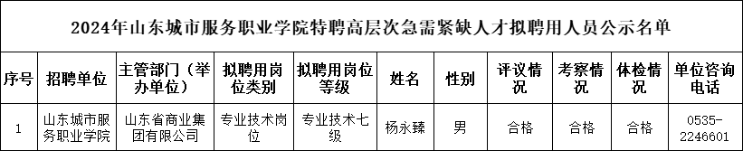 根據《山東省事業單位高層次急需緊缺人才特聘辦法》(魯人社規〔2017〕22號)等相關規定,山東城市服務職業學院通過特聘方式聘用高層次急需緊缺人才,現對擬聘用人員進行公示。公示期為7個工作日,自2024年5月30日至2024年6月7日(不含節假日)。公示期間,如對公示人選有異議,請及時向山東省商業集團有限公司反映。