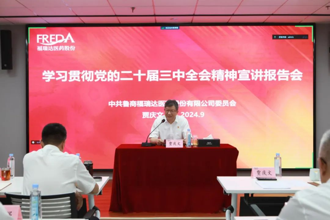 近日,魯商集團(tuán)黨委宣講團(tuán)成員,黨委常委、董事。副總經(jīng)理、工會主席,福瑞達(dá)黨委書記、董事長賈慶文到福瑞達(dá)宣講黨的二十屆三中全會精神。